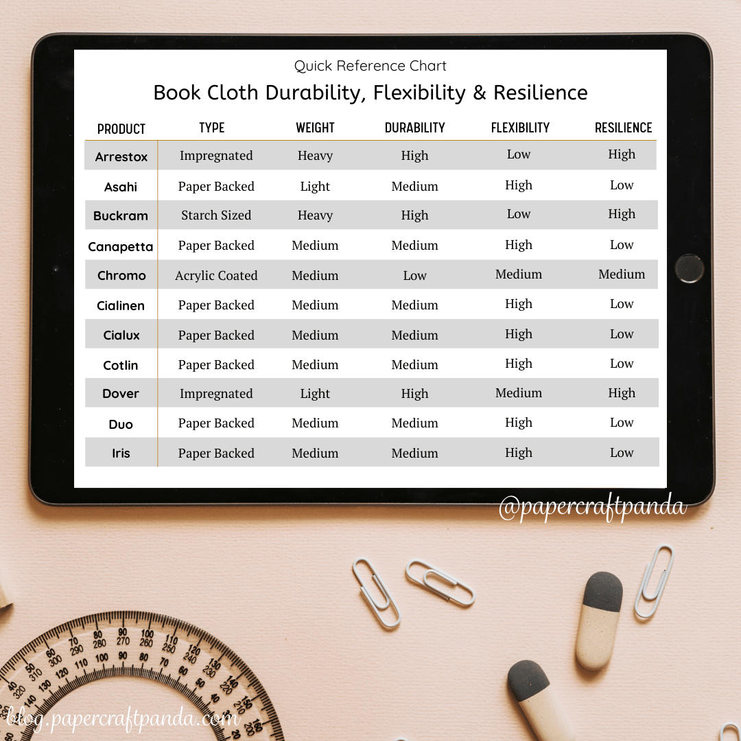 Choose the right book cloth for your next project with this easy at-a-glance reference chart created by an experienced bookbinder for makers of handmade journals, scrapbooks, albums & more.