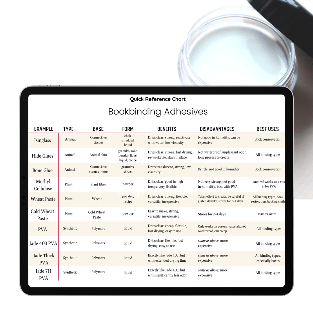 Choose the right bookbinding adhesive for your next project with this easy at-a-glance reference chart created by an experienced bookbinder for makers of handmade journals, scrapbooks, albums & more.